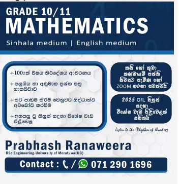 Grade 10 & 11 Mathematics(Sinhala/English medium) classes will be done by an undergraduate from faculty of Engineering, University of Moratuwa. Past and model paper questions will be discussed after each lesson.